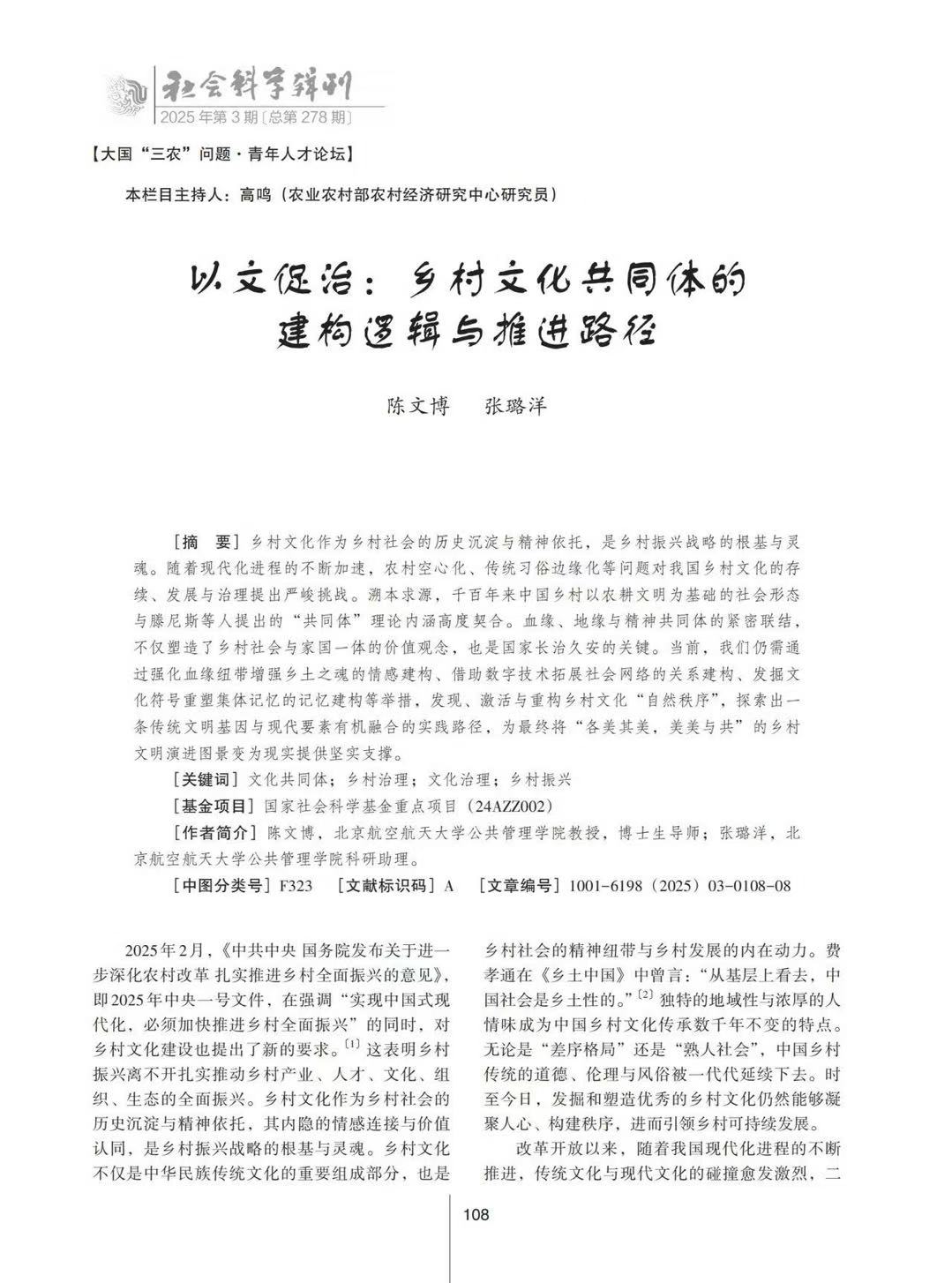 近日,北京航空航天大學人文社會科學學院(公共管理學院)陳文博教授、科研助理張璐洋在《社會科學輯刊》so米體育-NBAso米直播第3期發(fā)表《以文促治:鄉(xiāng)村文化共同體的建構邏輯與推進路徑》一文